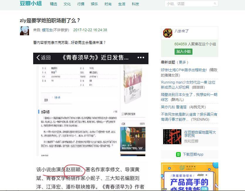 帖子標(biāo)題為“ZLY是要學(xué)她拍職場劇了么?”,內(nèi)文稱趙麗穎將拍攝一部職場劇,并附上了“實(shí)錘”截圖。