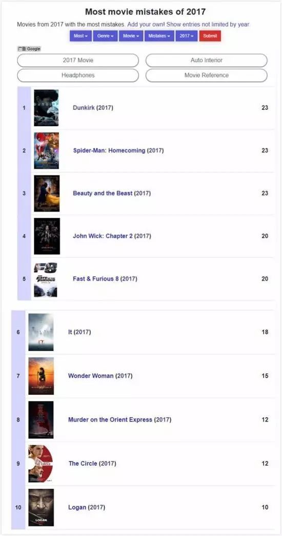 緊隨其后的是《疾速追殺2》和《速度與激情8》,均為20處穿幫鏡頭。排名第6至第10位的電影分別是《小丑回魂》(18處)、《神奇女俠》(15處)、《東方快車謀殺案》(12處)、《the circle》(12處)以及《金剛狼3:殊死一戰(zhàn)》(10處)。