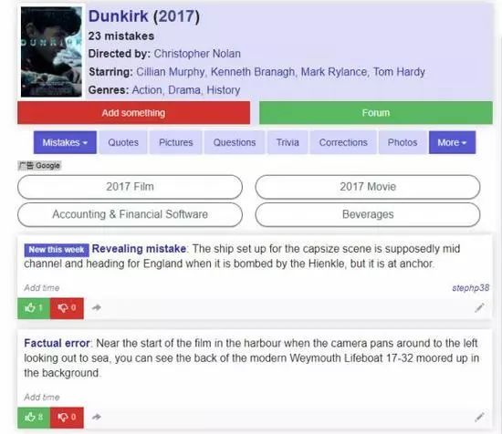 三部榜首電影上榜原因各不相同,《敦刻爾克》一片的穿幫鏡頭,多為事實性錯誤,即影片中呈現(xiàn)的故事,并未真實發(fā)生或尚未在影片講述的時間點發(fā)生。