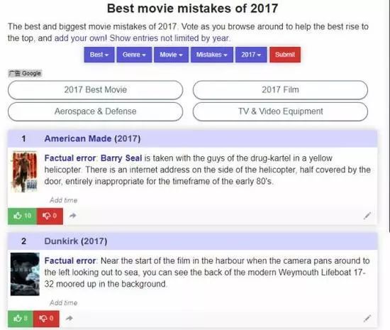 Moviemistakes.com是美國一家專門記錄電影穿幫鏡頭的網(wǎng)站。從2003年底開始,每年都會在網(wǎng)站上放出當年度的穿幫榜單。