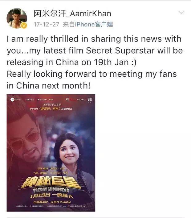 前不久,阿米爾·汗更新微博,字里行間難掩激動之情,“很興奮跟你們分享這個消息……我的最新電影《神秘巨星》將于1月19日在中國上映,真心期待下個月跟我的中國粉絲們見面!”盡管具體行程安排未知,但評論區(qū)迅速被粉絲表白占領(lǐng),紛紛表示,“好久不見了哇米叔!想您!”“一定支持男神新作”。