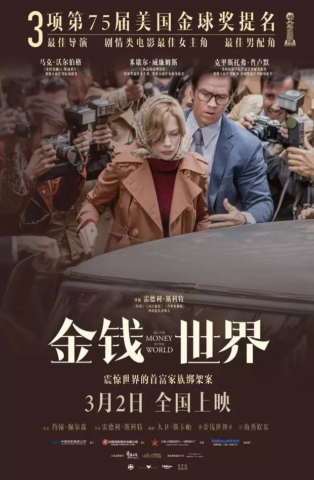 隨著定檔預(yù)告片發(fā)布,片方宣布由馬克·沃爾伯格、米歇爾·威廉姆斯、克里斯托弗·普盧默主演的《金錢世界》將在3月2日與內(nèi)地的觀眾見面。影片此前獲金球獎最佳女主角、最佳男配角、最佳導(dǎo)演三個重量級獎項提名,三位主演演技備受業(yè)界好評,《華爾街日報》的Joe Morgenstern直言:無論是否喜歡米歇爾之前的作品,都應(yīng)該來看看《金錢世界》,因為“她在該片中的表演給人巨大的驚喜”。