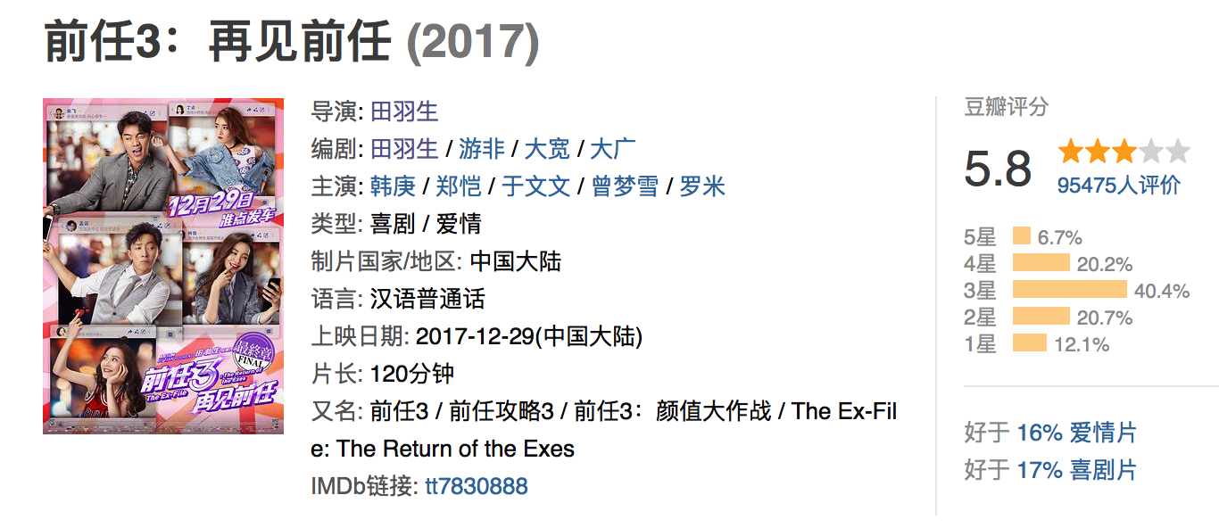 在一些大號的口誅筆伐中,說《前任3》“審美低下”的同時紛紛抬出了豆瓣評分,捎帶手還把前兩部拿出來鞭了鞭尸。當然講真?zhèn)€人也不是很care第二部。