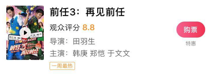 在貓眼購票app上,《前任3》評分高達9.2,淘票也達到了8.8。
