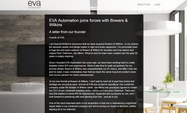 正如標題所說,老牌音響廠商Bowers & Wilkins被收購了,而收購方不是什么大公司,確切來說還只是一個只有40名員工的硅谷初創(chuàng)企業(yè)EVA Automation.收購金額似乎并沒有公開,對于EVA Automation這樣名不見經(jīng)傳的企業(yè)吞并像Bowers & Wilkins這樣的業(yè)界大佬,還真是罕見的例子.