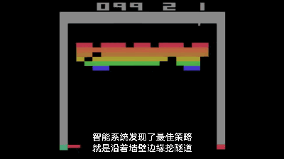 當(dāng)游戲進(jìn)行到500次的時(shí)候,智能系統(tǒng)甚至通過自主學(xué)習(xí)發(fā)現(xiàn)最佳策略,沿著墻壁邊緣挖隧道,讓小球在墻壁和磚塊之間來回反彈。