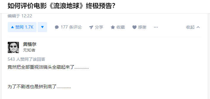據(jù)《流浪地球》制片人龔格爾在社交平臺上透露,目前公布的預告片中展現(xiàn)的特效還只是冰山一角,最精彩的內(nèi)容全在正片里。