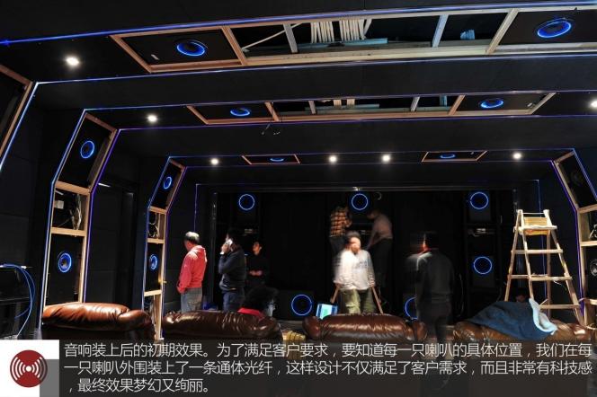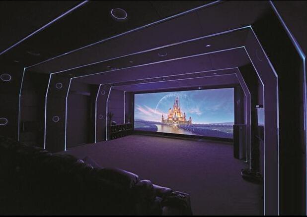 本案例中整個(gè)影院系統(tǒng)采用的是13.1聲道,環(huán)繞音箱采用的是天花吸頂式安放,正前方的音箱全部隱藏在一張6米寬的透聲幕后面,兩側(cè)及環(huán)繞音箱采取隱藏嵌入式安放。