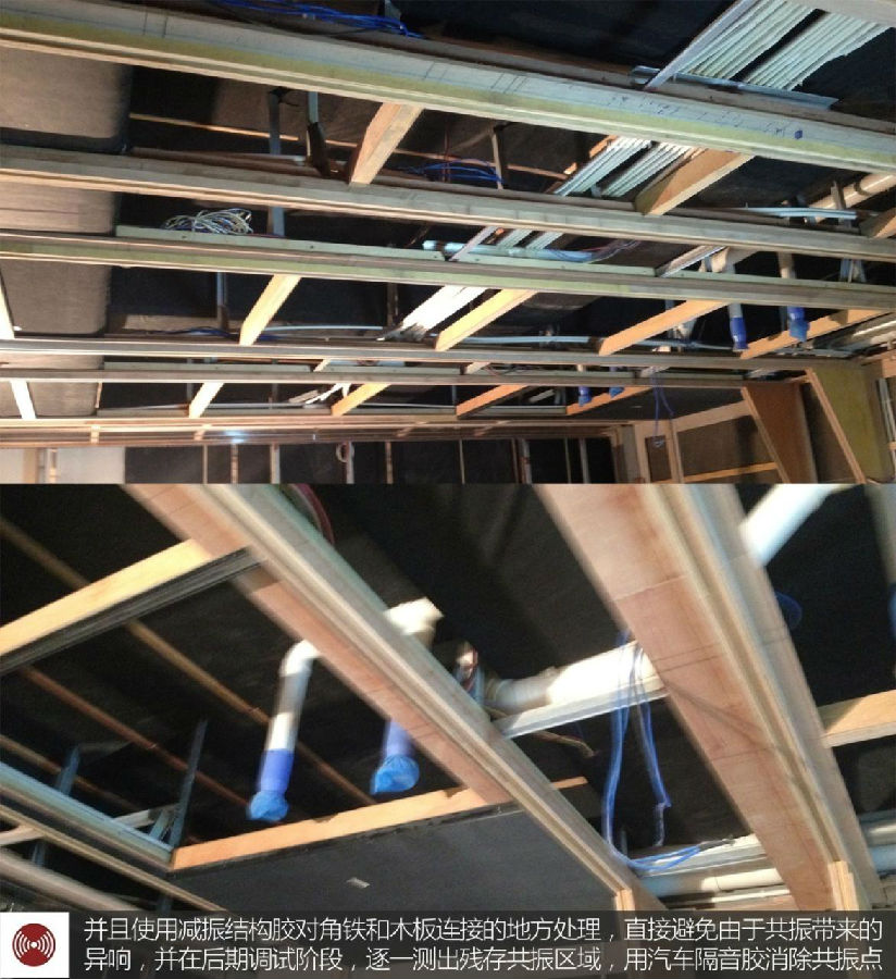 該視聽(tīng)室采用角鐵焊接的方式制作天花龍骨,為便于在天花安裝吸音裝飾層,在角鐵上釘制木板,并且使用減振結(jié)構(gòu)膠對(duì)角鐵和木板連接的地方處理,直接避免由于共振帶來(lái)的異響,并在后期調(diào)試階段,逐一測(cè)出殘存共振區(qū)域,用汽車(chē)隔音膠消除共振點(diǎn)。