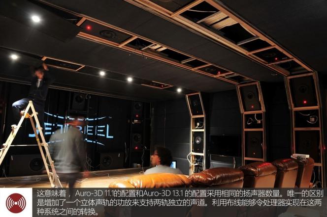 在音箱的布局上,視聽(tīng)室內(nèi)采用三層式音箱布局來(lái)實(shí)現(xiàn)對(duì)Auro-3D和Dolby Atmos這兩種音效的兼容。一共使用了32只音箱來(lái)構(gòu)建,分別是前方、左右兩側(cè)的上/下層以及天花均安裝了6只音箱,后方上/下層共4只,再加上前后各2個(gè)超低音音箱。那到底這32只音箱怎么去分配?怎么去切換?其實(shí),當(dāng)重播Auro-3D音效的時(shí)候,全部喇叭都是一起投入工作的。而當(dāng)重播Dolby Atmos音效時(shí)就是前方、左右兩側(cè)和后方的所有下層音箱、頭頂?shù)?span style="box-sizing: border-box; margin: 0px; padding: 0px; list-style: none; font-family: Calibri;">6只音箱以及4只低音音箱投入工作。
