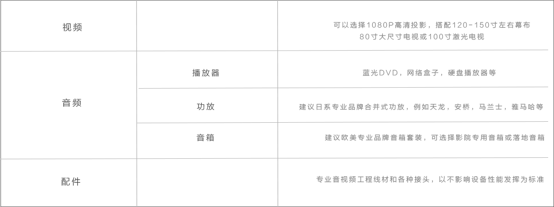 入門級私家影院適合一般家庭使用,對音效沒有極致要求,使用面積不太大或沒有獨(dú)立空間,性價(jià)比較高。入門級的影院定制方案,以性價(jià)比為出發(fā)點(diǎn),又能夠滿足一般家庭的影音娛樂需求,影院的效果在感官體驗(yàn)上與普通的商業(yè)電影院相媲美。