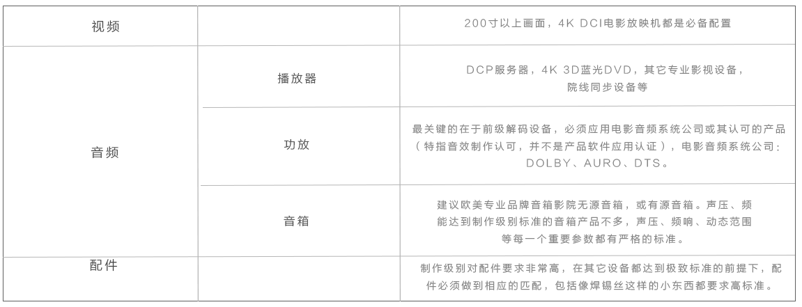完全達(dá)到電影后期制作標(biāo)準(zhǔn),音效和畫質(zhì)均為目前世界最高技術(shù)標(biāo)準(zhǔn),無(wú)與倫比的視聽體驗(yàn)。非現(xiàn)場(chǎng)無(wú)法想象。重新定義奢華的影音生活方式。